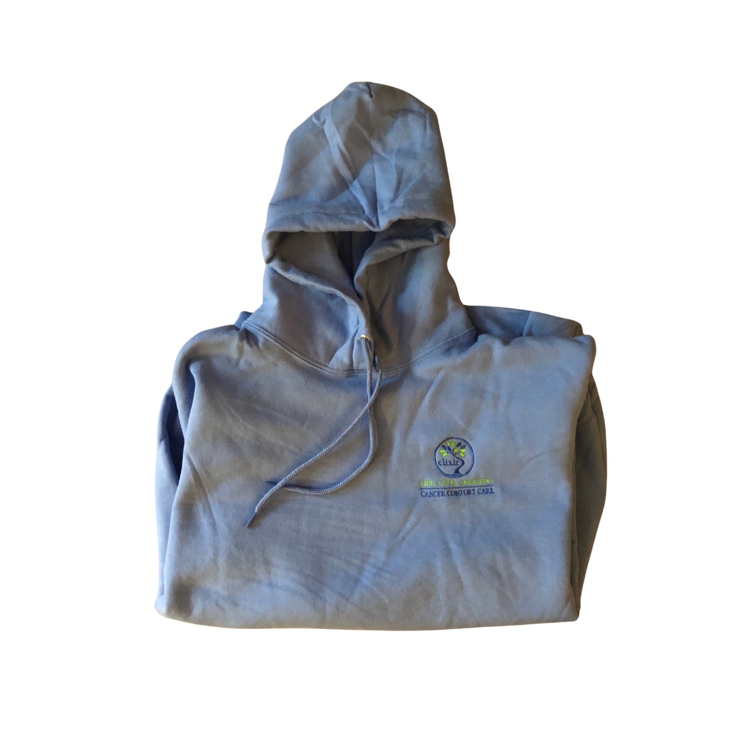 Light blue, soft fleece lined hooded sweatshirt with the Elixir Fund logo.