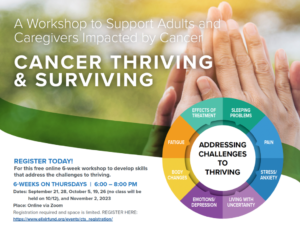 Developed by Stanford University, this licensed program in self-management is proven to help those impacted by cancer to better manage the challenges to thriving. Whether you are newly diagnosed, in treatment or post treatment, this program is for you. The curriculum covers issues experienced by many such as managing fatigue: pain and sleep; dealing with difficult emotions and relationships; staying active and communicating with providers, family and friends. Learn More