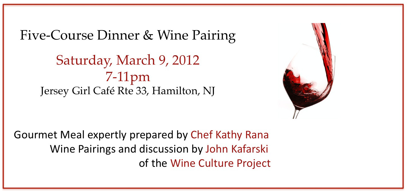 Chef Kathy Rana of Jersey Girl Cafe & Madeline’s Table will prepare a gourmet five-course meal and John Kafarski of the Wine Culture Project will not only pair wines with the meal, but will also provide a brief discussion of each. The event will take place on Saturday, March 9, 2013 at 7pm Jersey Girl Cafe, 731 Rte 33, Hamilton, NJ.