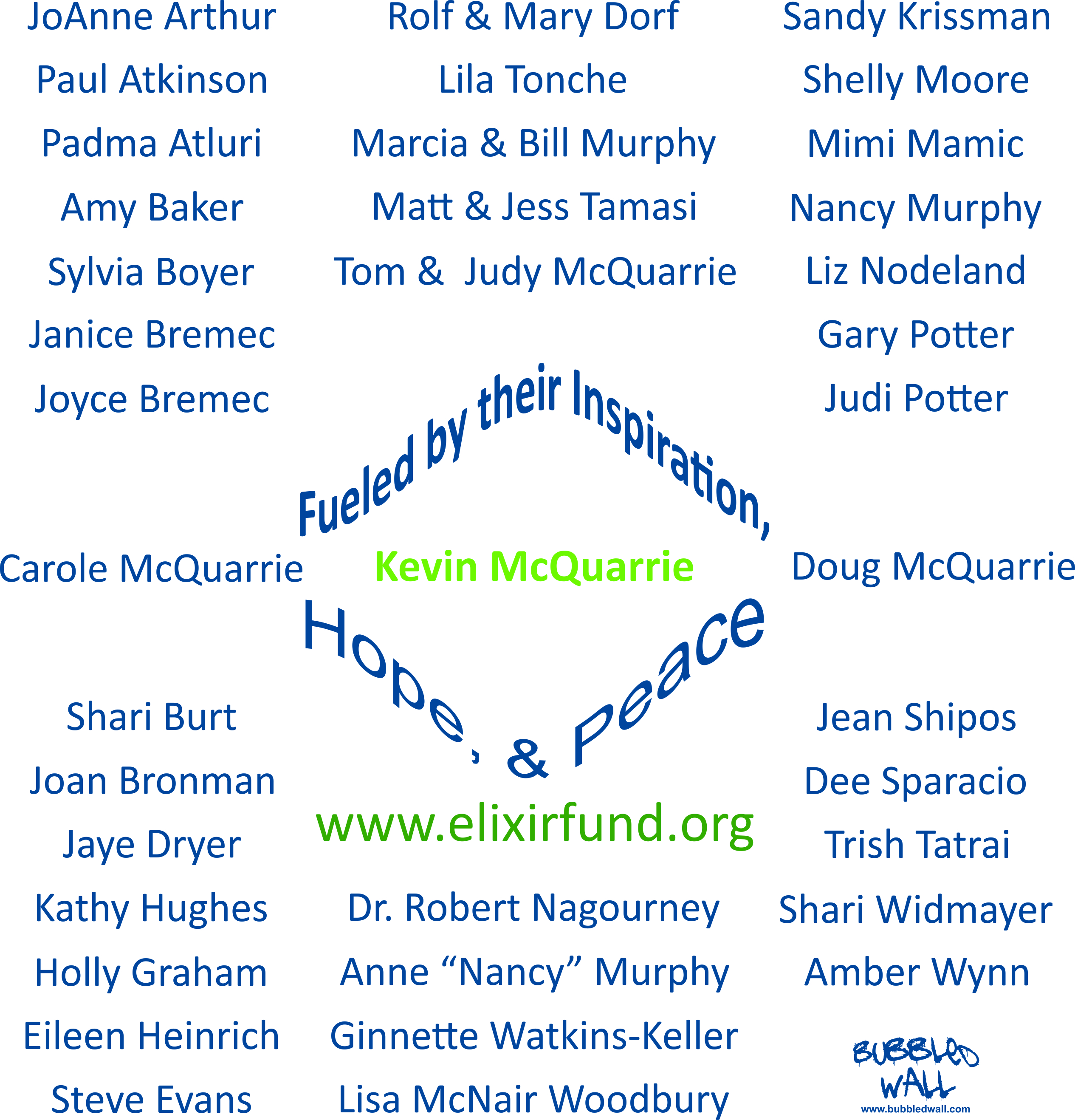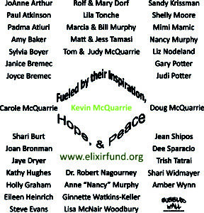 From Meg McQuarrie: When my brother Kevin was diagnosed with cancer, at first resistant to the idea of treatment, he made peace with it and then charted his own course. Rather than view it as a battle, he chose to live with cancer – and live he did! This was the inspiration behind the Elixir Fund and over the last 11 years I have had the pleasure of meeting many impacted by cancer- patients, caregivers, doctors, nurses, social workers – who have inspired me not only with their strength and courage, but with their grace and peace.